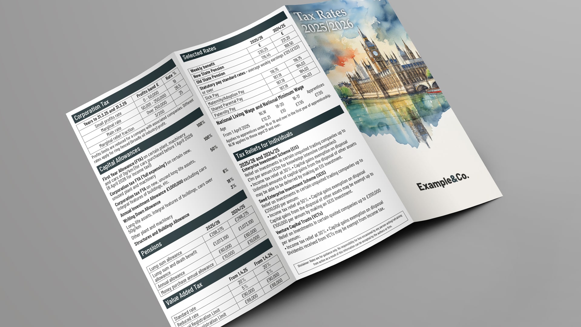A comprehensive summary of the Chancellor’s Budget announcement available to you the following day, making sure your clients have the important information when they need it. Our tax rates cover the latest rates and detail for each tax year, available in a variety of sizes and formats.